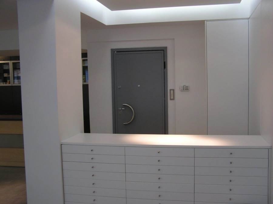 - διαμόρφωση εσωτερικού με χωρίσματα από γυψοσανίδα & γυαλί, ψευδοροφές (με κρυφό φωτισμό στον εκθεσιακό χώρο), ενιαίο πάτωμα (ανθρακί πλακάκι 40x40cm)